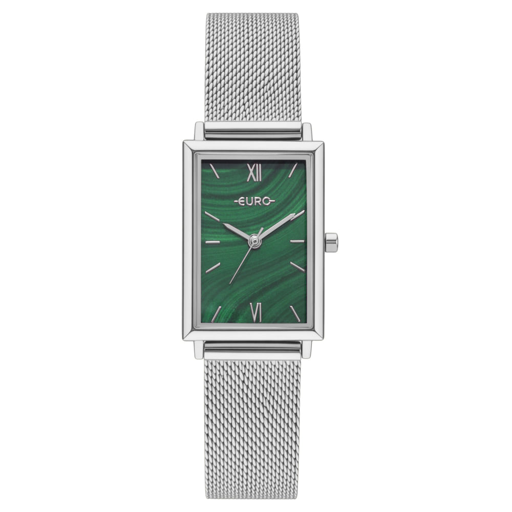 A coleção Glitz traduz brilho com atitude. Modelo em banho prateado, estilo fashion, caixa retangular de linhas retas e acabamento joalheiro preciso, com presença arquitetônica marcante, mostrador verde com textura marmorizada romanos aplicados, criando contraste gráfico e leitura refinada.