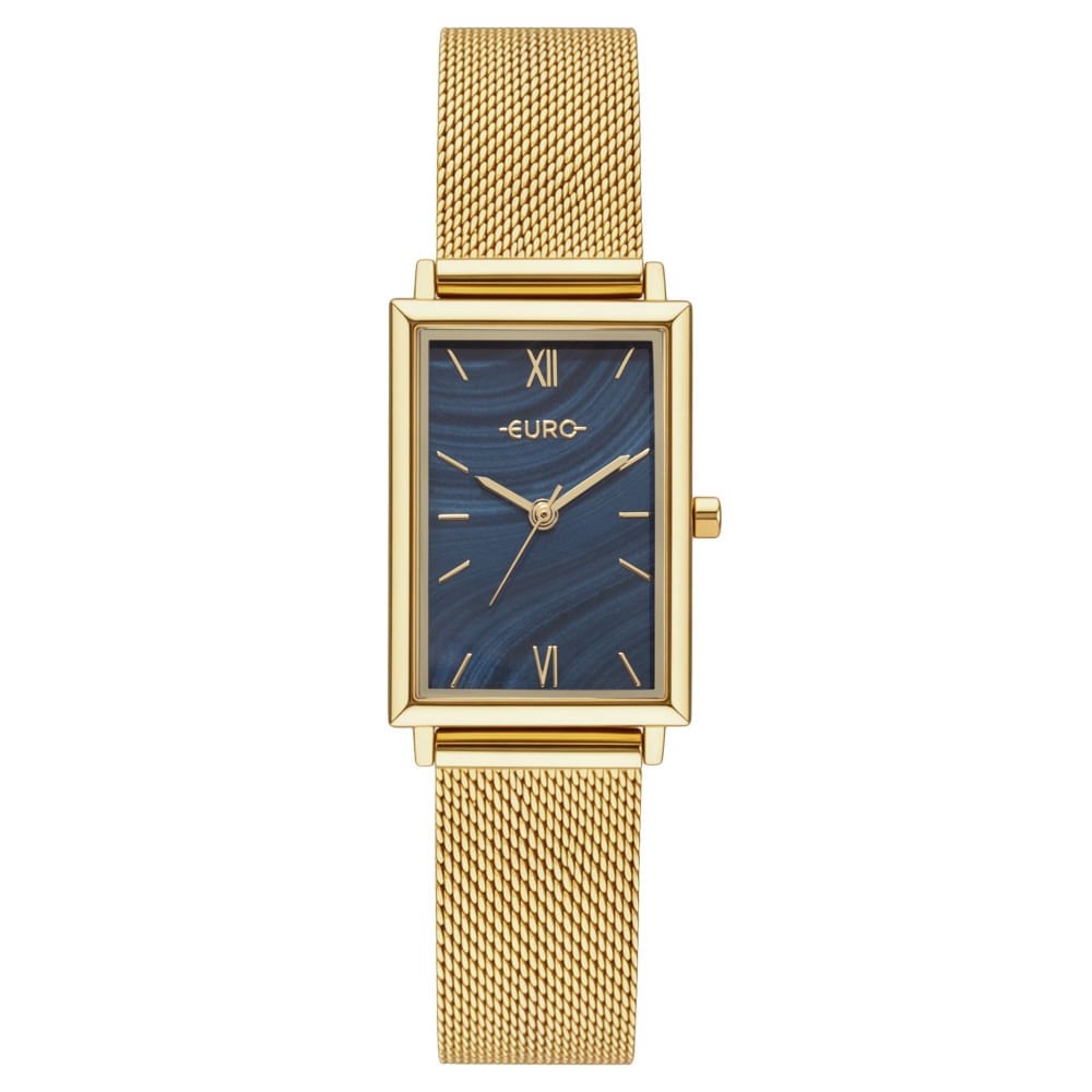 A coleção Glitz traduz brilho com atitude. Modelo em banho dourado, estilo fashion, caixa retangular de linhas retas e acabamento joalheiro preciso, com presença arquitetônica marcante, mostrador azul com textura marmorizada romanos aplicados, criando contraste gráfico e leitura refinada.