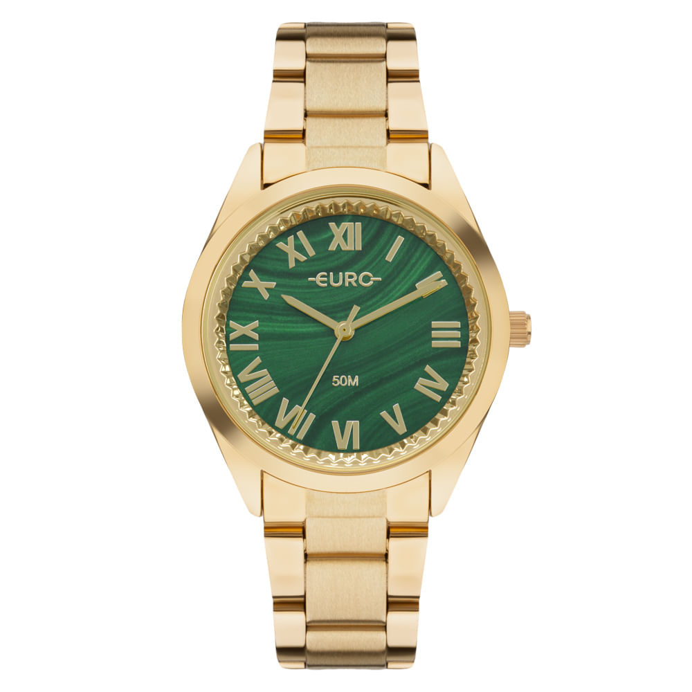A coleção Glitz traduz brilho com atitude. Modelo em banho dourado, estilo fashion, mostrador verde com textura marmorizada e índices romanos aplicados, criando leitura sofisticada e identidade marcante.